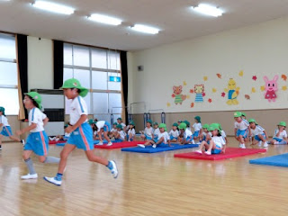 遊戯室に戻ると 年長まつ組さんさつき組さんが 体育指導中