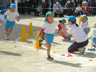 年少さんの障害物走では 年長さんが 優しく年少さんに声掛けしてくれます